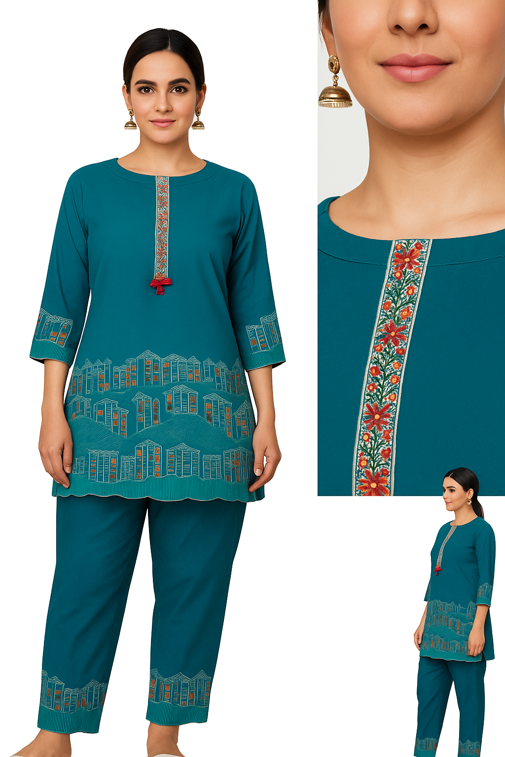 Teal Cotton Co-ord Set with Artistic House Print & Embroidered Tassel Detailing – Kurti & Straight Pants
